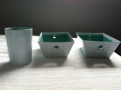 I found these little aqua greek key treasures in the dollar bin. Perfect score for organizing small items for the office/craft room.