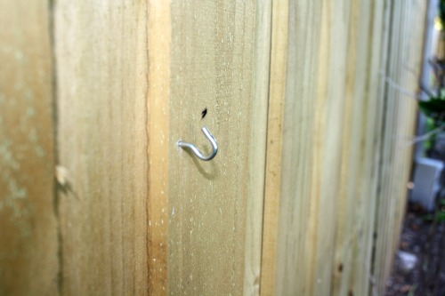 We drilled randomly placed holes for hooks into the wood fence in the appropriate sunny/shady areas to help start the base of our new garden.