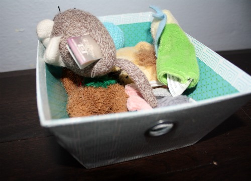 The mutts need more storage than a tiny paper bin. A Target purchase in the shape of metal beverage tin which was a clearance find was the answer for them.