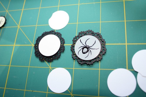 I stuck them onto small pieces of paper and used a bit of black ribbon glued to the back of the paper to make a way for them to hang from the wreath.