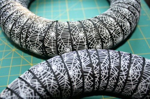 I made sure to wrap the ribbon with a bit of overlap to cover the form completely but without covering up too much of the design. I used a quilting pin on the back of the wreath to hold down the ribbon so if I messed up or changed my mind, I could just unpin and unravel it instead of worrying about glue.