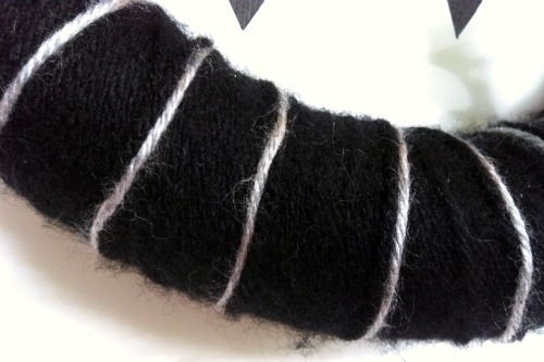 I simply wrapped the black yarn tightly around the entire wreath form. After I was done I went back and wrapped a gray piece of yarn spaced out around the form to give it a bit of interest.