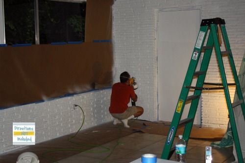 Our family room is covered in slump brick, a thin and uneven brick with deep grooves which makes painting it a tedious task. Since we bought this fixer upper in December of last year we have lived with the dingy painted brick that is sprinkled with touches of orange too. If you are new here and are trying to figure out what the dark spot in corner of the room is, take a look at this post to see some of the crazy things we inherited when we bought this place.