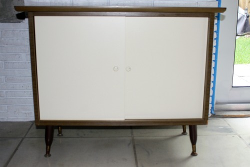 During my sanity break a couple of weeks ago, I picked up this little mid-century modern wine cabinet at a thrift store. The formica was beat up everywhere and it needed help but it was only $18 so I brought it home.