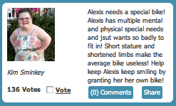 Kimberly from Tiaras and Bowties, has a sweet and adorable high-schooler named Alexis. This sweet girl has special needs and hasn’t had the best time fitting into high school. High school can be cruel and I can’t even imagine what it is like for someone who struggles with other needs. Alexis is still smiling despite her struggles and we can all help keep her smiling by taking two minutes to vote for her in a contest to win a special bike. The blogging community comes together all the time and I know we can do it for Alexis.