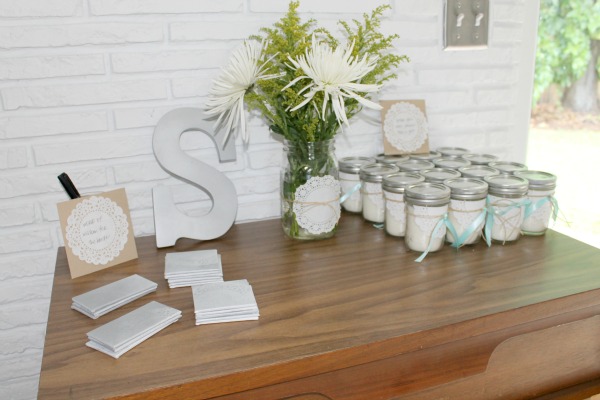 I dressed up my thrift store scoreย for the guest book and the mason jar soy candle favors.
